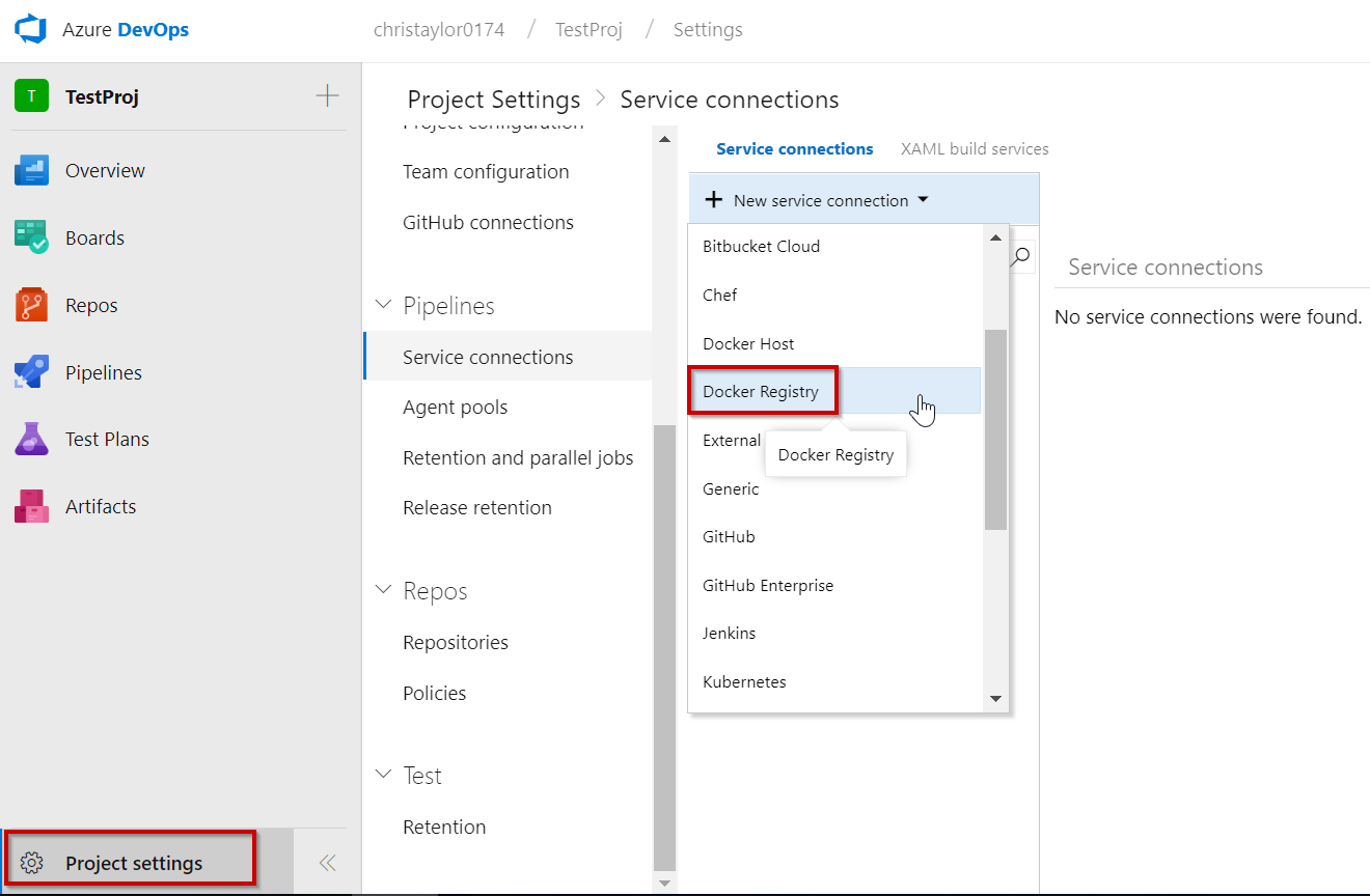 We can do this by selecting Service Connections from the Project Settings. From the image below you can see that there are a large variety of service connections that can be created but we will be choosing Docker Registry: