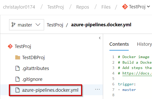 If you have a Docker Hub account, and you want to push the image to your Docker Hub registry, use the web UI to change the YAML file in the build pipeline from azure-pipelines.yml to azure-pipelines.docker.yml. This file is present at the root of your sample repository.