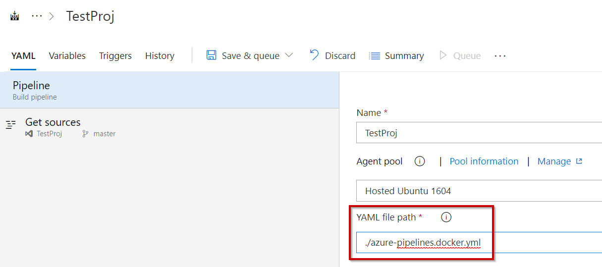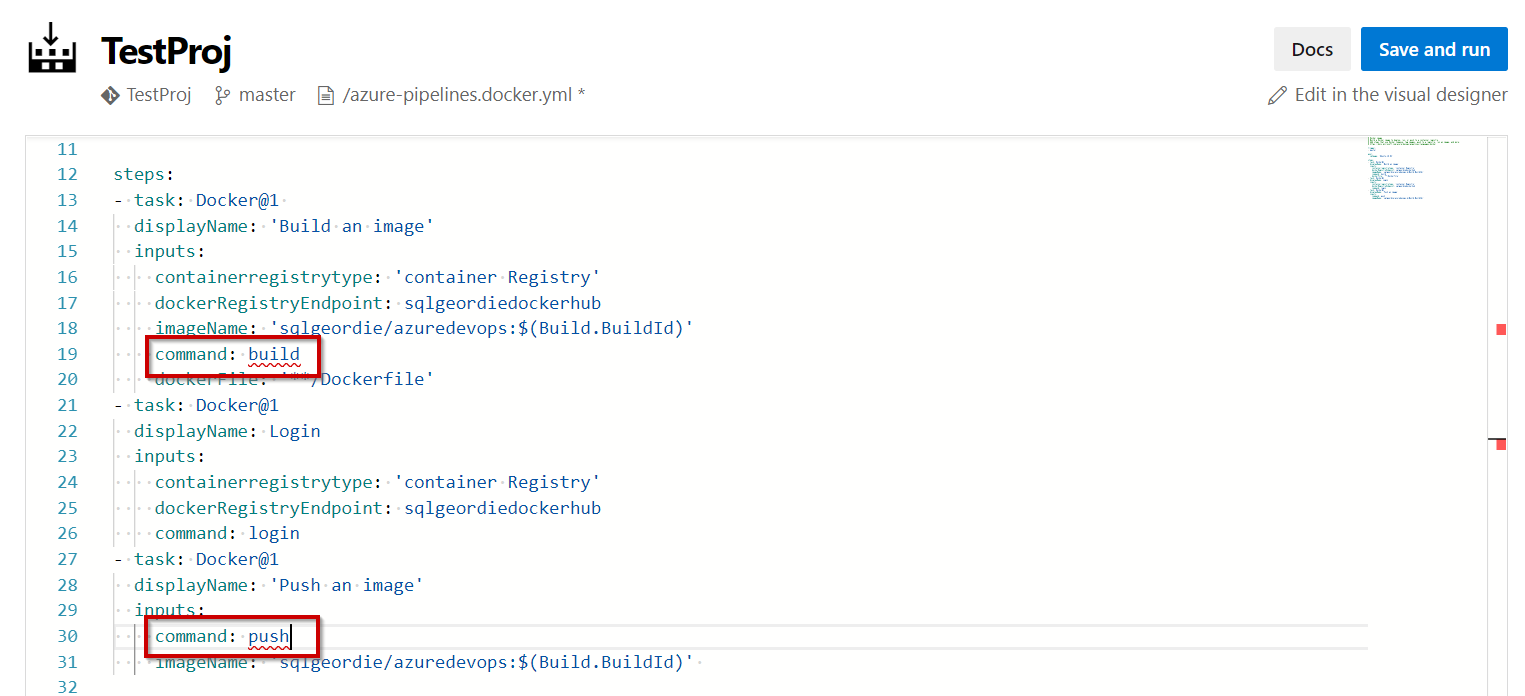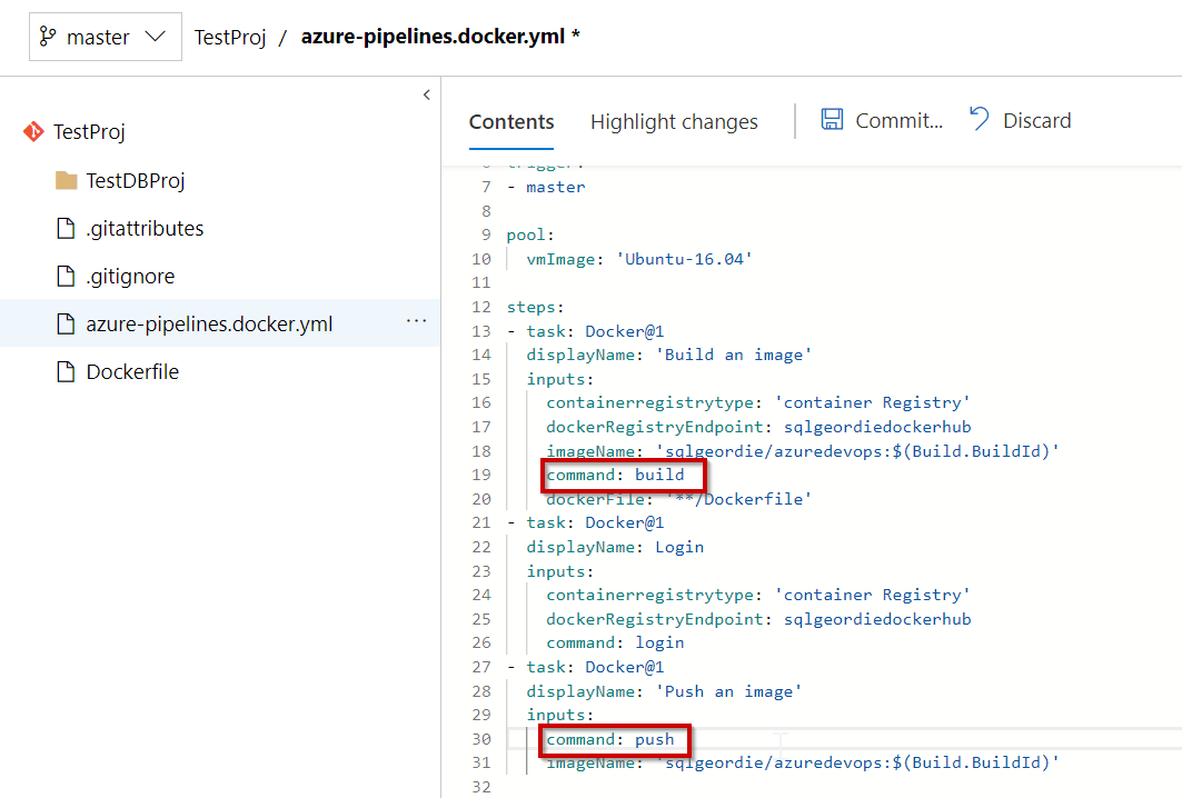 As we are using DockerHub as opposed to MCR we have to make a change to the azure-pipelines.yml file which will be used.