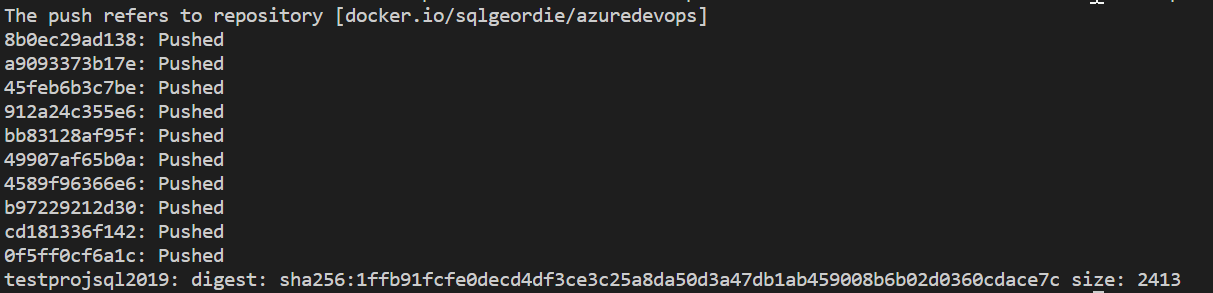 Now push this image up to Docker Hub giving it the tag “testprojsql2019“: