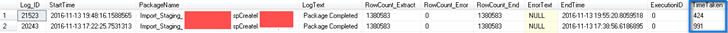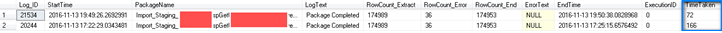 Two package execution time examples (trust me that they are the same package) showing that with Delayed Durability the processing time was only 43% (166sec down to 72sec and 991sec to 424sec) ) of that without Delayed Durability set. Apologies for the poor image quality….